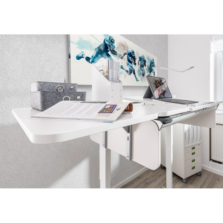 In a nutshell: the e-Champion sets new standards while retaining the proven moll quality. New standards: The innovative and electric height adjustment with an adjustment range of 63-128cm. Proven quality: The tiltable desk top segment, sophisticated and versatile extension options to the rear and to the side and regional production made in Germany.