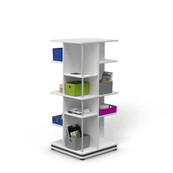 Die MollDer Turm dreht sich mit dem geräuschlosen Drehtellersystem. Um Quetschgefahr zu vermeiden, ist der Sockel mit einem weichen Quetschschutzstreifen ausgestattet. Durch die Drehfunktion ist jedes Fach im Regal leicht erreichbar.