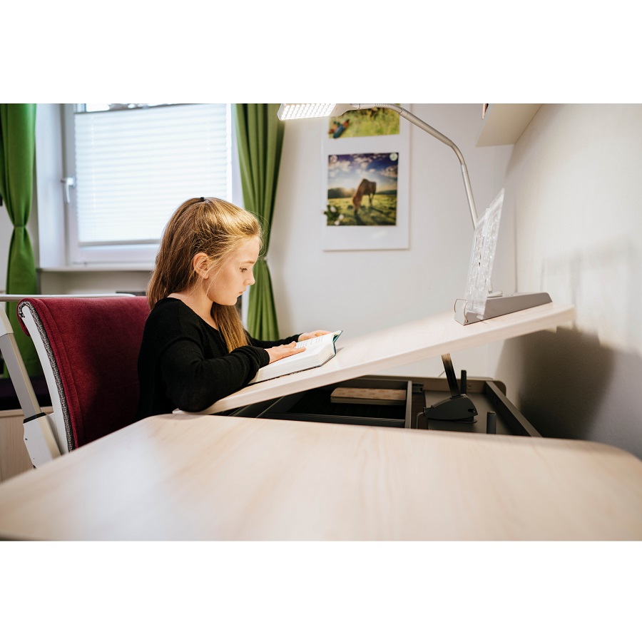 Dazu zählen der praktische Taschenhaken, die transparente Buchstütze und das magnetische Abziehlineal: So bleiben Buch und Co. immer griffbereit. Bleiben Sie immer an Ort und Stelle, wenn die Tischplatte geneigt ist.